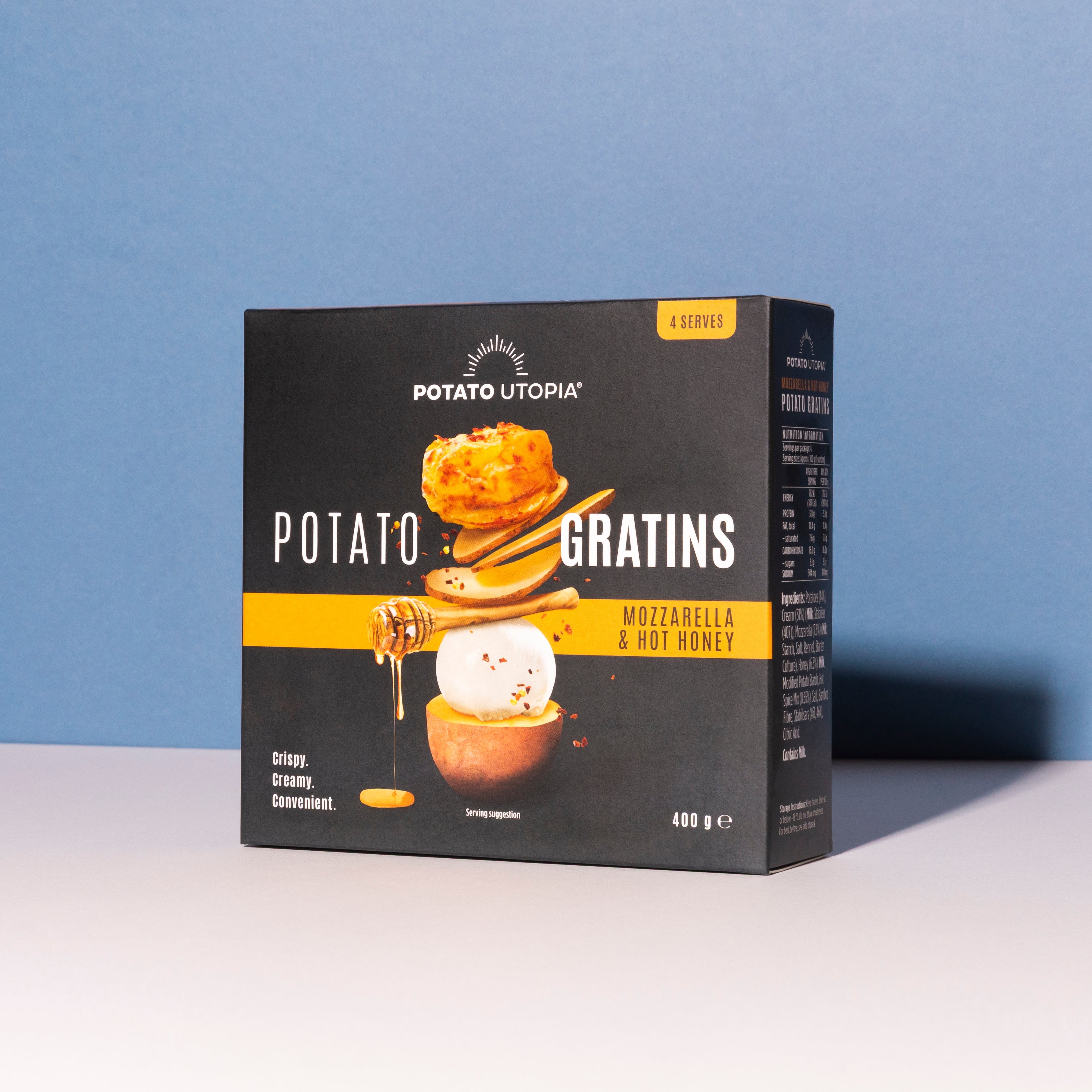 Layers of potato, cream, gooey mozzarella, and a drizzle of hot honey. Golden and bubbling on top, creamy and a touch fiery underneath. The troublemaker on the dinner table …