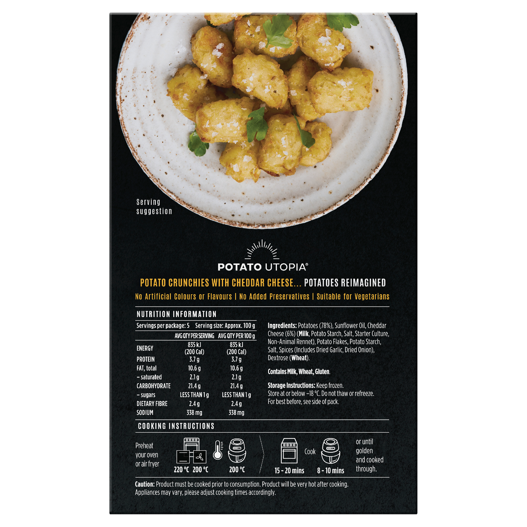 Delicious, crunchy bites of potato goodness, with a deluxe dose of cheddar cheese. We did heaps of work on the crispiness, so it doesn't become a hot mess after a couple of minutes.