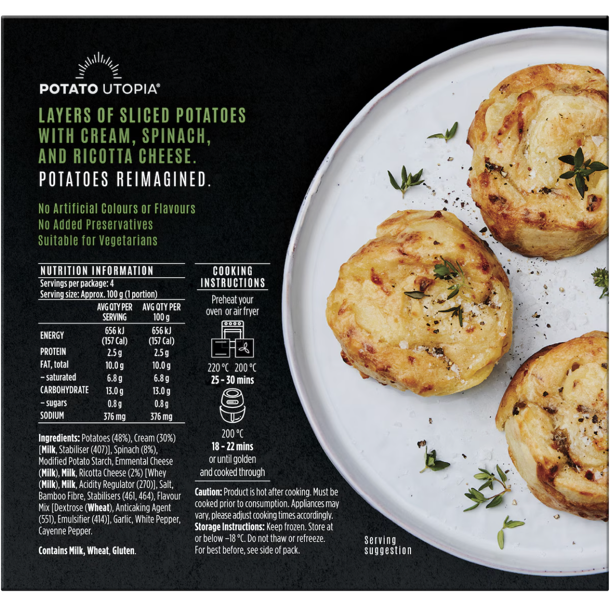 Creamy ricotta, tender spinach, and layers of golden potato come together in a perfectly portioned bake that’s rich and comforting